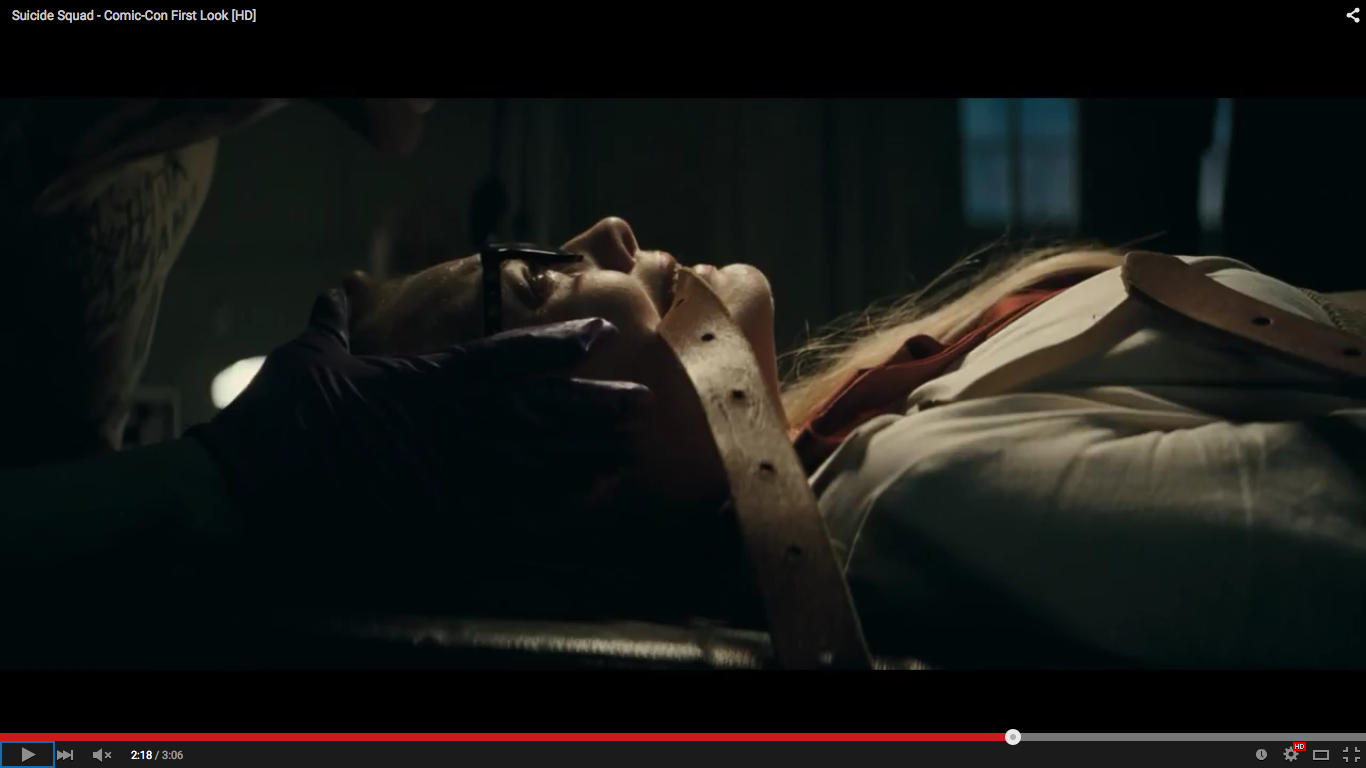 To me this looks like this is Ayer’s take on Harley Quinn’s origin. Shock treatment by the Joker, terrifying. In case you were wondering, you can see that it is the Joker by looking at his ‘Haha’-tattoo on his arm, and the purple surgical glove which can also be seen in the final shot of the trailer.