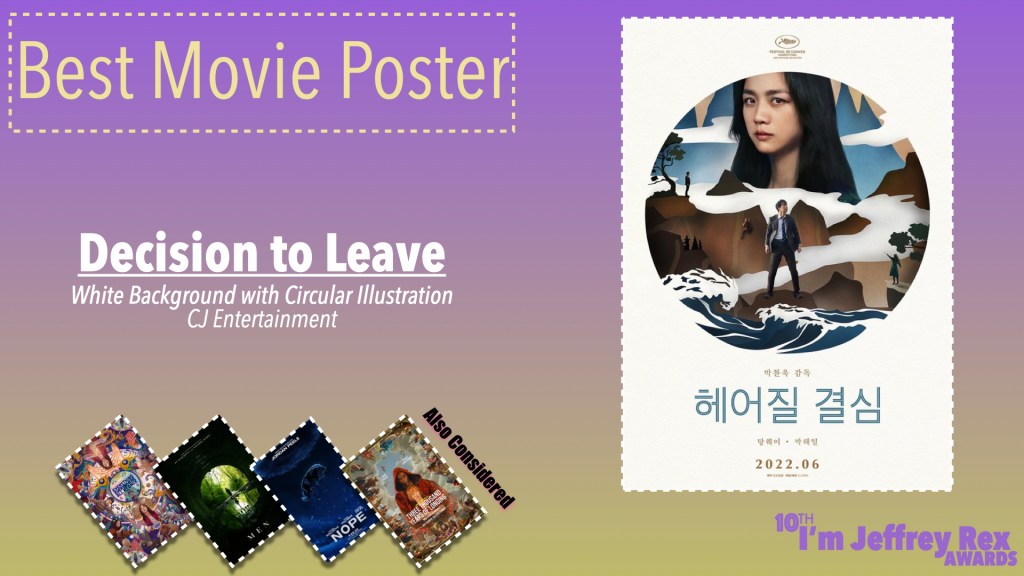 A strong selection of great posters in 2022, but I landed on the Decision to Leave poster because of minimalistic yet mysterious it is, as well as because of how its circular central design speaks to central lines and events. I would genuinely hang this on my wall.