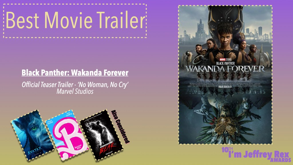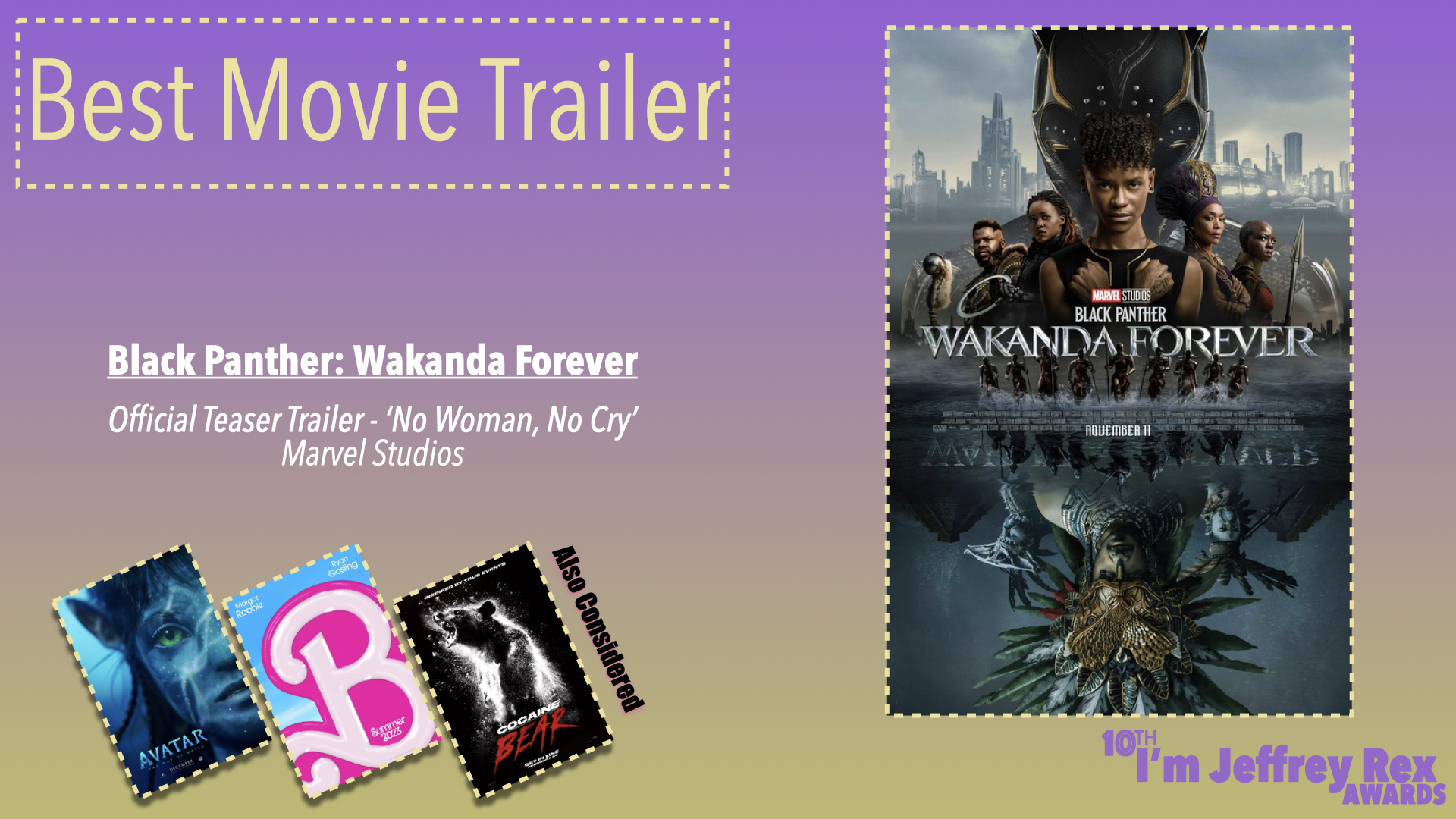 - Best Movie Trailer — 2022 — Black Panther: Wakanda Forever — Official Teaser Trailer: “No Woman, No Cry.”