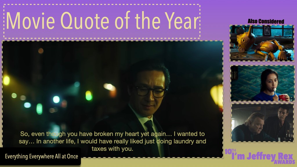 - Movie Quote of the Year — 2022 — Everything Everywhere All at Once — “So, even though you have broken my heart yet again… I wanted to say… In another life, I would have really liked just doing laundry and taxes with you.”