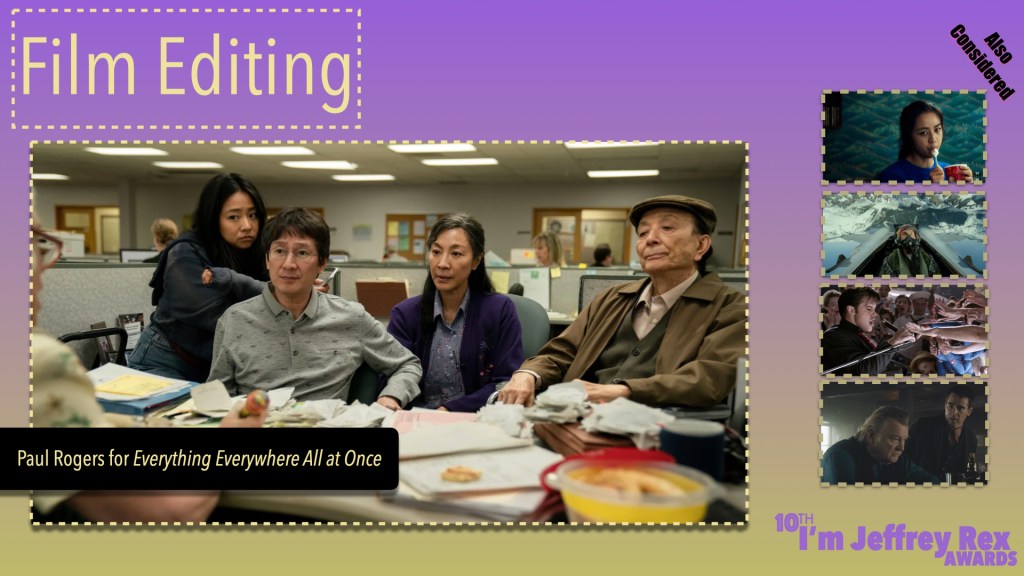 Similarly, this one just had to go to Everything Everywhere All at Once. I called it a catch-all cinematic experience in my review of it, and the editing has so much to do with that. It’s quirky, exciting, and overwhelming. So good.