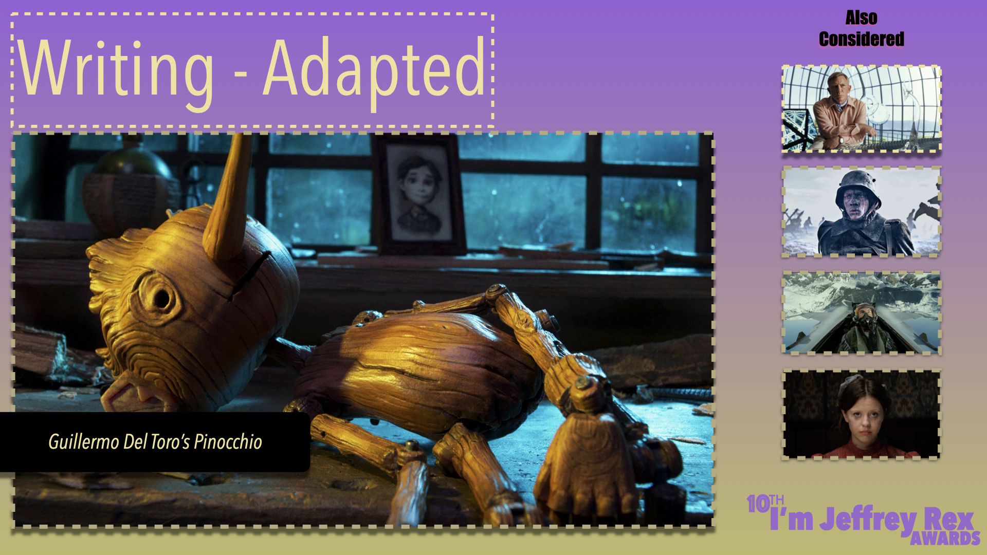 - Best Writing, Adapted Screenplay — 2022 — Guillermo Del Toro’s Pinocchio.