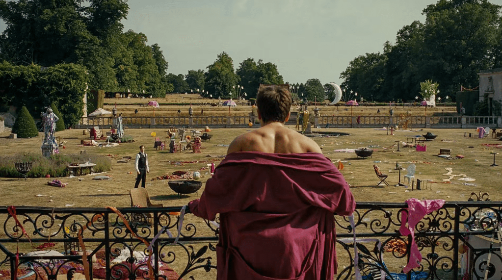 The film features three long-ish takes where we watch the backs of characters as they move through a strange environment — one being the Oxford University campus, the second being the titular castle, and the third long take is probably best experienced without any prior knowledge — and I thought all of these made strong impressions. I feel that they must have been designed to be juxtaposed with one another. Perhaps this was in an attempt to highlight how different the characters of Oliver and Felix are — or present themselves as — in these sequences. In the first sequence, Oliver, dressed proudly in formal school clothing, walks confusedly among so many university students who look down on him, whereas — in the second of these sequences — Felix, dressed in über-cool casual clothing, guides his friend through his family castle as he gives off vibes indicating a breezy familiarity like it is all nothing special. The reason that I highlight these long takes (though, technically, the second one is broken up using reaction shots of Oliver Quick’s face) is that this film is all about keeping up appearances, blending in or standing out, and winning people over.