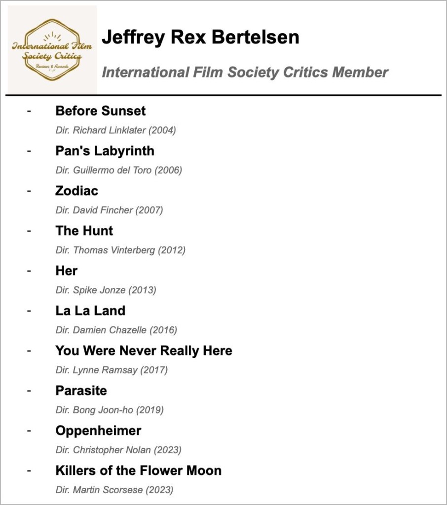 “Martin Scorsese balances his focus between both the Osage Nation and those that circled them like wolves in his monumental neo-western historical epic, partly concerned with interrogating our understanding of US history. Its conclusion shows a level of self-awareness and reflection from the master filmmaker that indicates that he knows full well how dangerous it is for the wrong people to tell others’ stories. It insists that we reckon with the loss of life that has been cruelly swept under the rug of history, and, through a moment of self-insertion, Scorsese invites you to consider what part we all play.” – Jeffrey Rex Bertelsen’s IFSCA 100-word Review Blurb for Killers of the Flower Moon (#65).