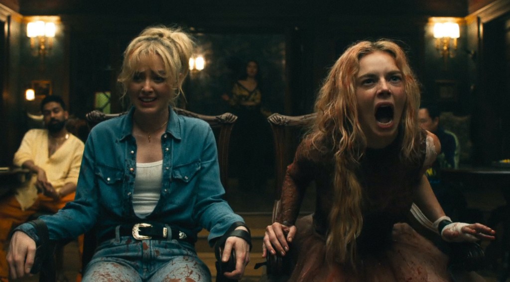 Matt Bettinelli-Olpin and Tyler Gillett’s Ready or Not 2: Here I Come kicks off right where the popular first film left off. Grace (played by Samara Weaving) has just survived a crazy ordeal moments after getting married. Her new family — the Le Domas’, who were secretly satanists — tried to kill her before sunrise, as they believed they would all die if they didn’t. Grace, now in a bloodied wedding dress, survived the night, while her in-laws and her new husband all exploded at dawn for not fulfilling their satanic bargain. But things aren’t over for our bloodsoaked heroine. When she meets up with her sister Faith (played by Kathryn Newton), with whom she hasn’t spoken in years, at a hospital, they’re both incapacitated and taken to the manor of a wealthy and influential family known as the Danforths. The Danforths are one of multiple families with a seat on a council of elite families, who all owe their successes to their supernatural satanic lord known as Le Bail. Because Grace survived the night, the families must compete in another game of diabolical hide-and-seek to determine who will have the ‘high seat’ on the council and, essentially, control the world. To survive, Grace, now alongside her sister, must again overcome the odds and hold out until dawn.