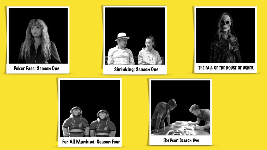 (Clockwise L-R) Natasha Lyonne in POKER FACE (Peacock / SkyShowtime), Harrison Ford and Lukita Maxwell in SHRINKING (Apple TV+), Carla Gugino in THE FALL OF THE HOUSE OF USHER (Netflix), FOR ALL MANKIND (Apple TV+), and THE BEAR (Disney+ / FX).