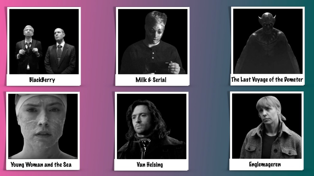 (L-R, top row) BLACKBERRY (Elevation Pictures); MILK & SERIAL (that’s a bad idea); THE LAST VOYAGE OF THE DEMETER (Universal Pictures). (L-R, bottom row) YOUNG WOMAN AND THE SEA (Disney); VAN HELSING (Universal Pictures); Englemageren (SF Film).