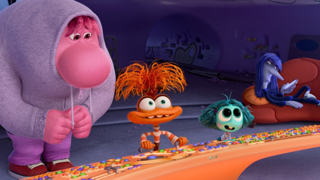 Embarrassment (voiced by Paul Walter Hauser), Anxiety (voiced by Maya Hawke), Envy (voiced by Ayo Edebiri), and Ennui (voiced by Adèle Exarchopoulos) in Inside Out 2 — PHOTO: Disney.