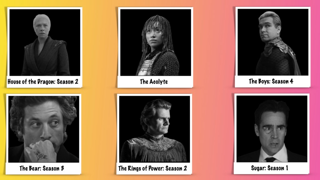 (L-R, top row) HOUSE OF THE DRAGON (Max); THE ACOLYTE (Disney+); THE BOYS (Prime Video). (L-R, bottom row) THE BEAR (Disney+/Hulu); THE RINGS OF POWER (Prime Video); SUGAR (Apple TV+).